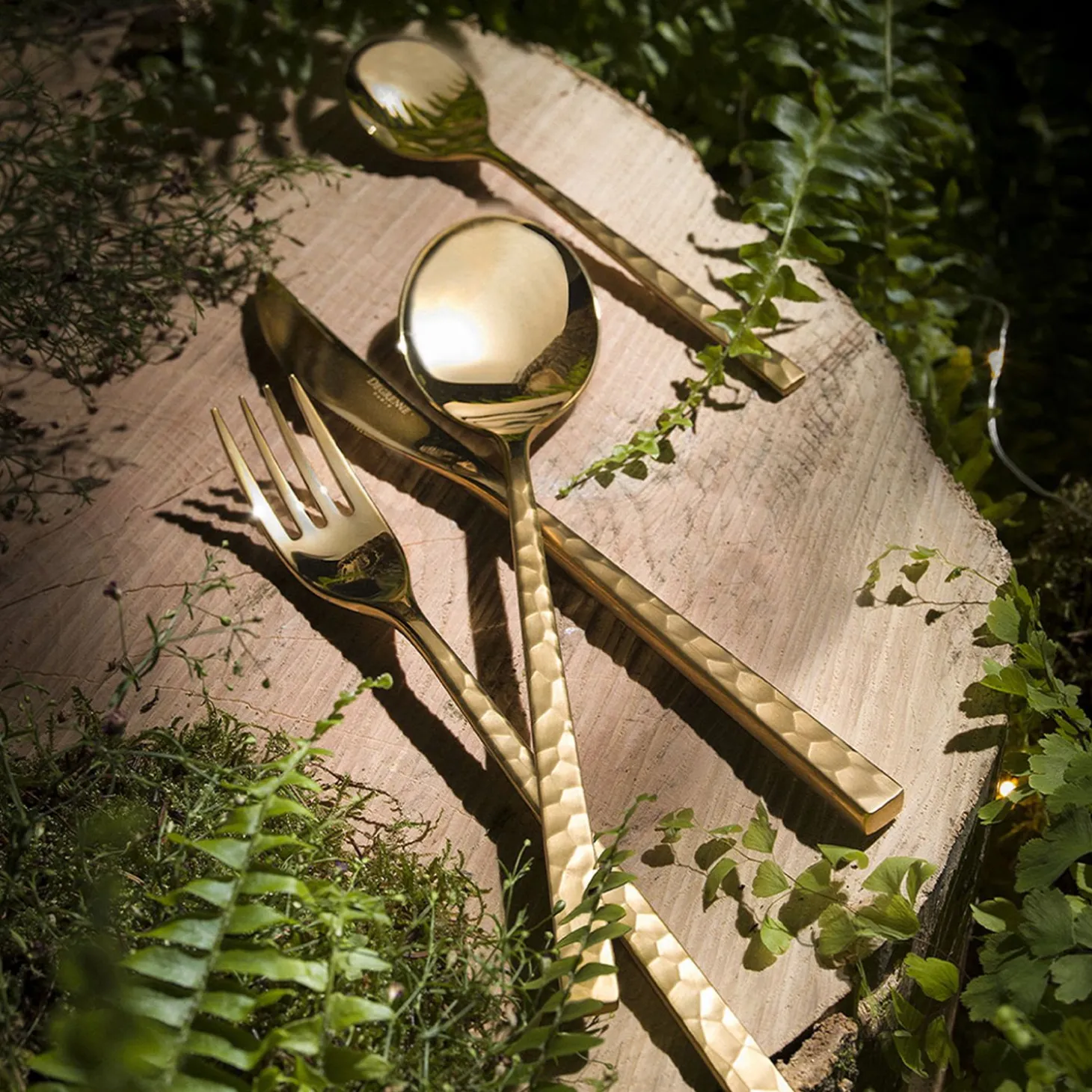Audace, Élégance Et Tendance, Le Couvert Fuse Se Décline Dans Une Teinte Délicatement Dorée. Le Contraste, Entre La Texture Brute Et Authentique Des Couverts Et Leur Teinte Dorée, Sublime Le Travail De La Nature Et Donne Du Caractère Et De L’Originalité À Votre Table. La Finition Laiton Est Obtenue Grâce À Une Technique Complexe, Qui Apporte Un Éclat Incomparable Mais Néanmoins Délicat Qui Pourra Se Patiner Dans Le Temps, Donnant Toujours Plus De Caractère À Votre Table. Il Est Conseillé D’Accorder Une Attention Particulière À Ces Couverts, Et De Ne Pas Utiliser Le Programme Intensif Au Lave-Vaisselle Qui Soit Supérieur À 50°.